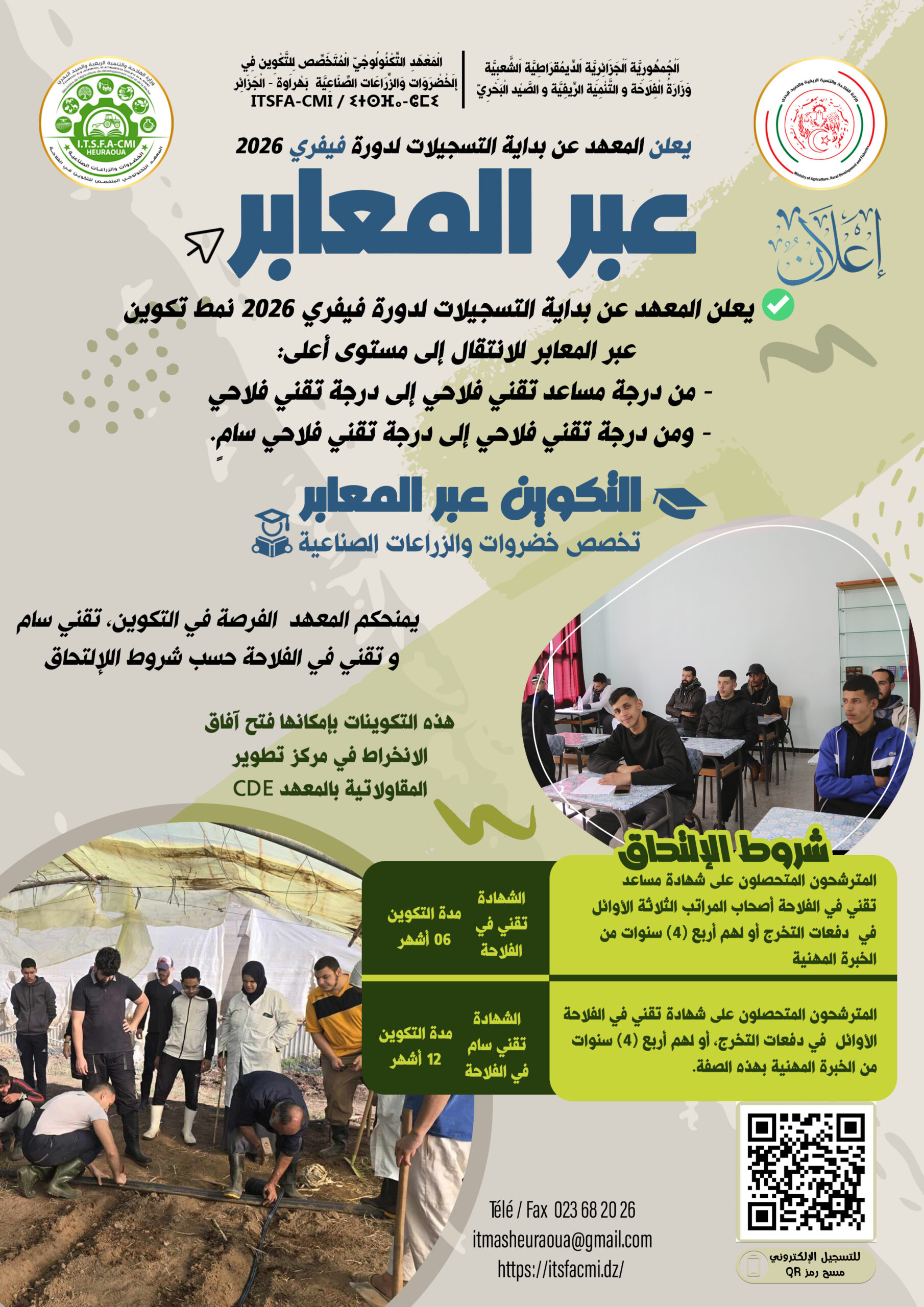 مختلف الإعلانات المتعلقة بمجال التكوين الفلاحي قصد إعلام الطلبة، المكوّنين، والمهتمين بالقطاع الفحلاحي بكل المستجدات.